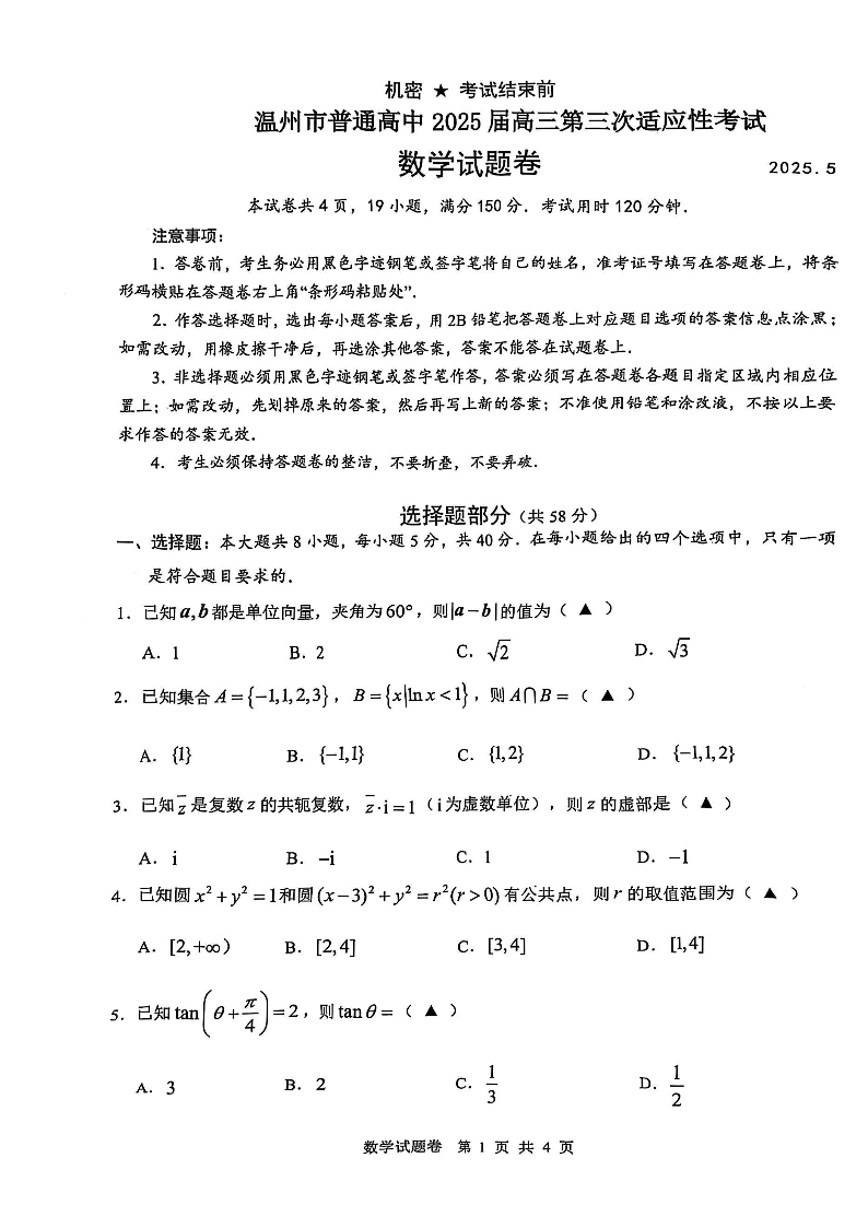 浙江省温州市普通高中2025届高三第三次适应性考试数学
