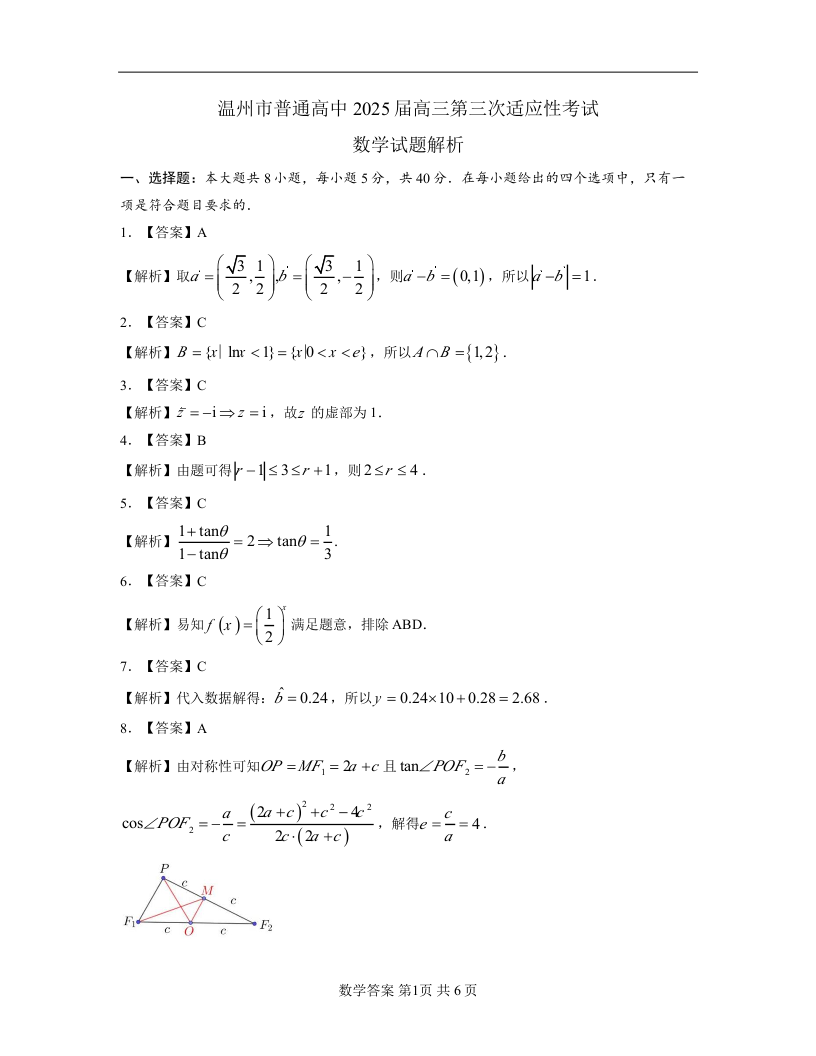 浙江省温州市普通高中2025届高三第三次适应性考试数学答案