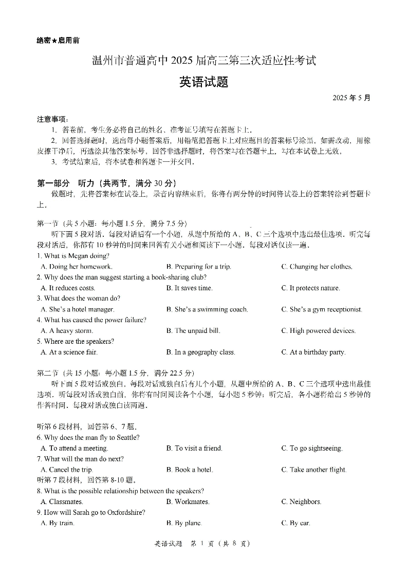 浙江省温州市普通高中2025届高三第三次适应性考试英语