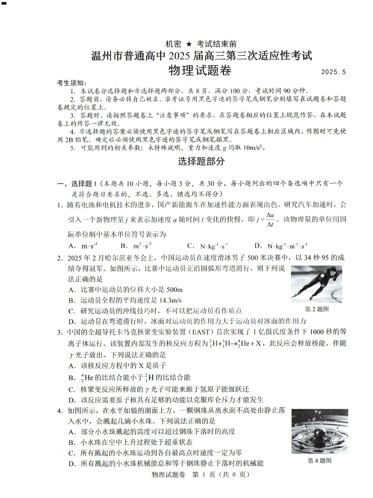 浙江省温州市普通高中2025届高三第三次适应性考试物理