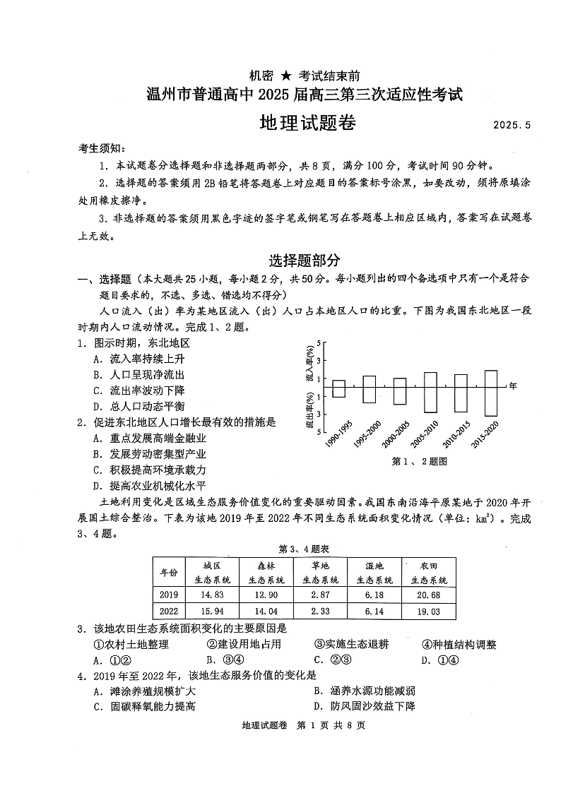 浙江省温州市普通高中2025届高三第三次适应性考试地理