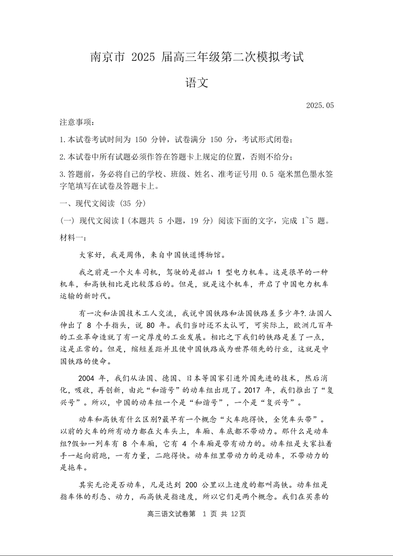 江苏省南京市2025届高三年级第二次模拟考试语文+答案