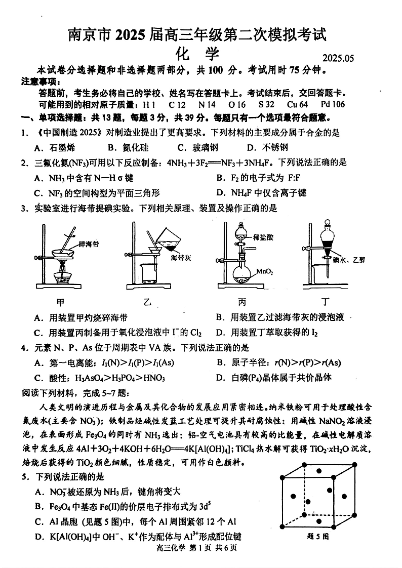 江苏省南京市2025届高三年级第二次模拟考试化学+答案