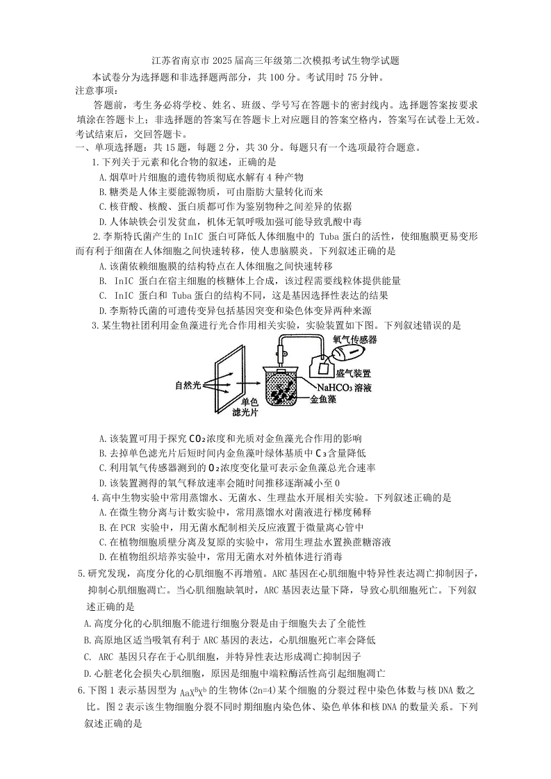 江苏省南京市2025届高三年级第二次模拟考试生物+答案