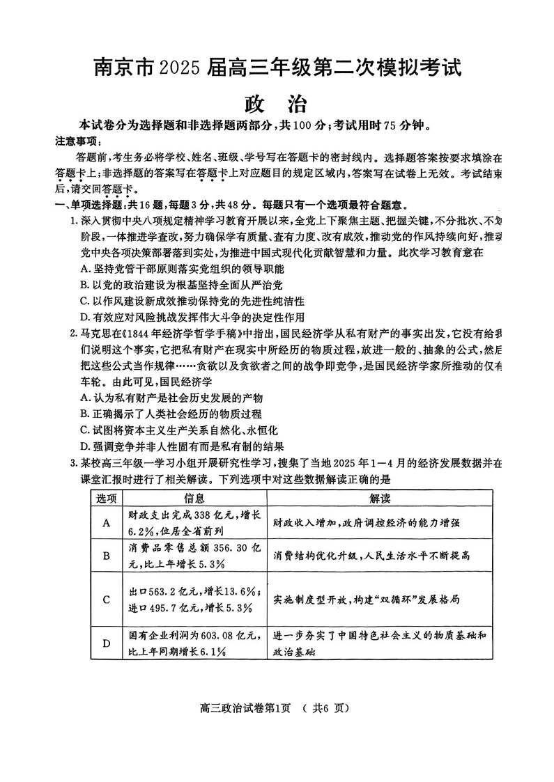 江苏省南京市2025届高三年级第二次模拟考试政治+答案
