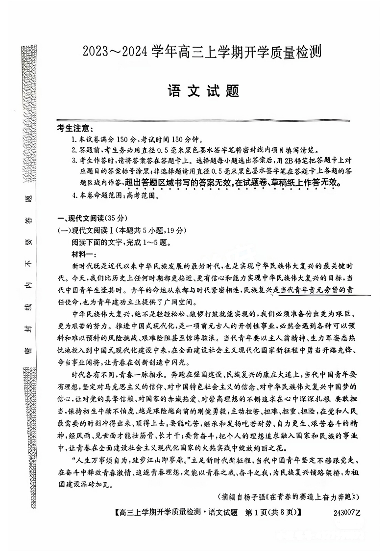 山西省金科大联考2024届高三上学期开学检测语文