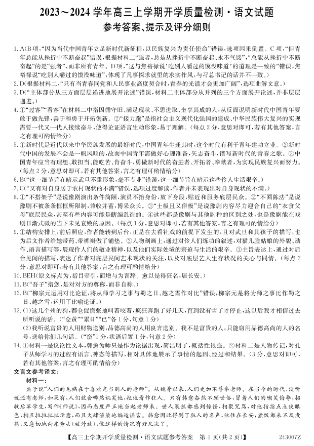 山西省金科大联考2024届高三上学期开学检测语文答案