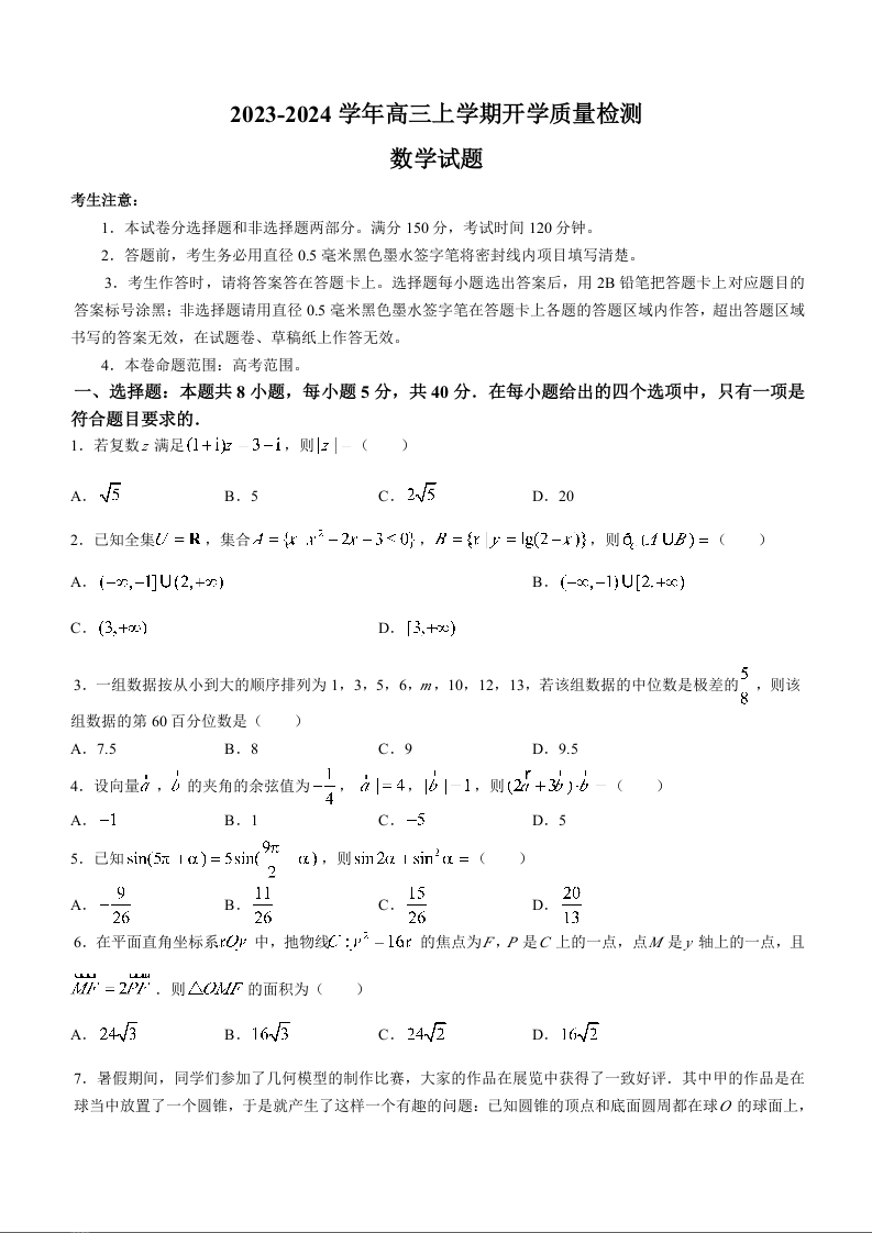 山西省金科大联考2024届高三上学期开学检测数学+答案