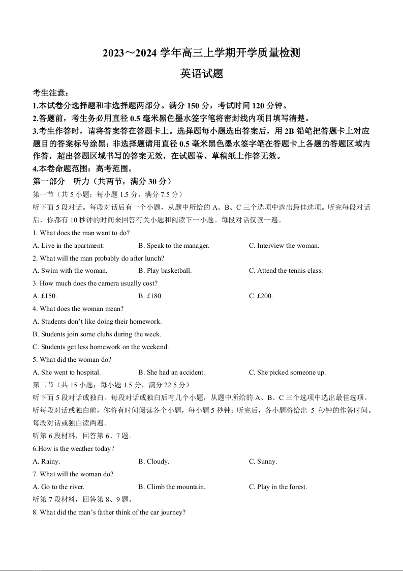山西省金科大联考2024届高三上学期开学检测英语+答案