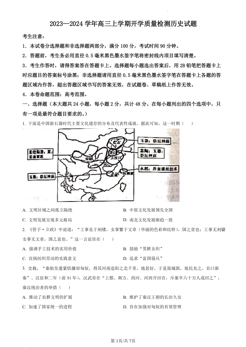 山西省金科大联考2024届高三上学期开学检测历史(原卷版)
