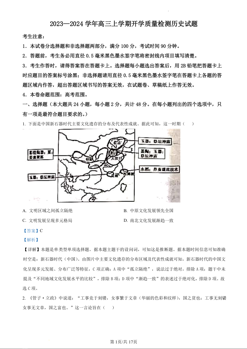 山西省金科大联考2024届高三上学期开学检测历史(精品解析版)