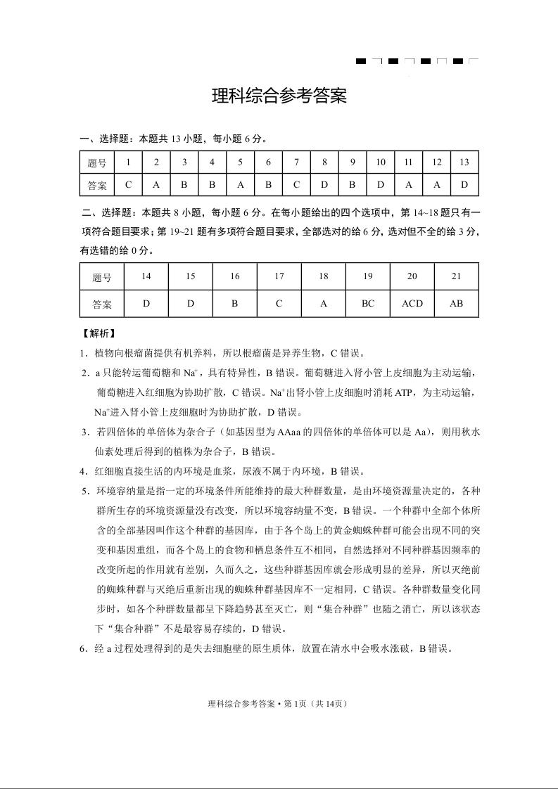 云南省昆明市2024届云南师范大学附属中学高考适应性月考(二)理综答案