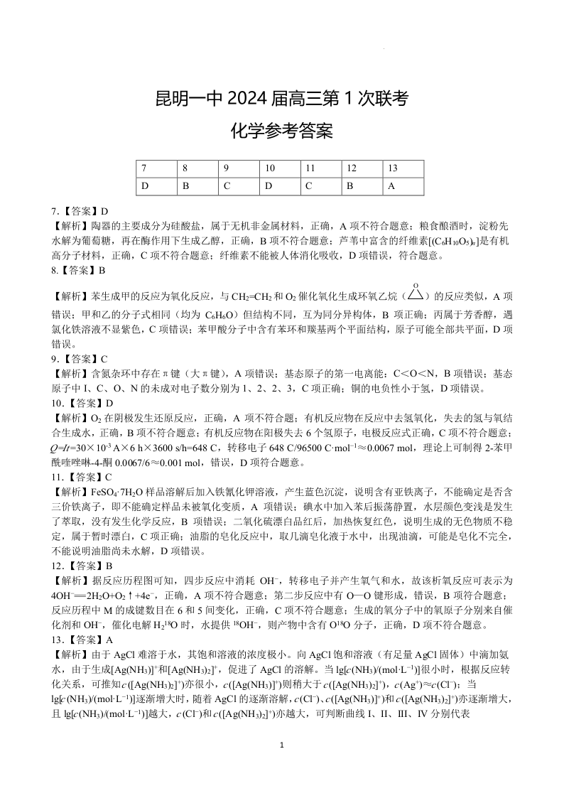 云南省昆明市第一中学2024届高中新课标高三第一次摸底考化学答案
