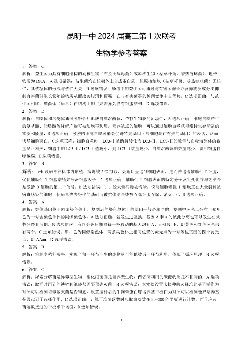 云南省昆明市第一中学2024届高中新课标高三第一次摸底考生物答案