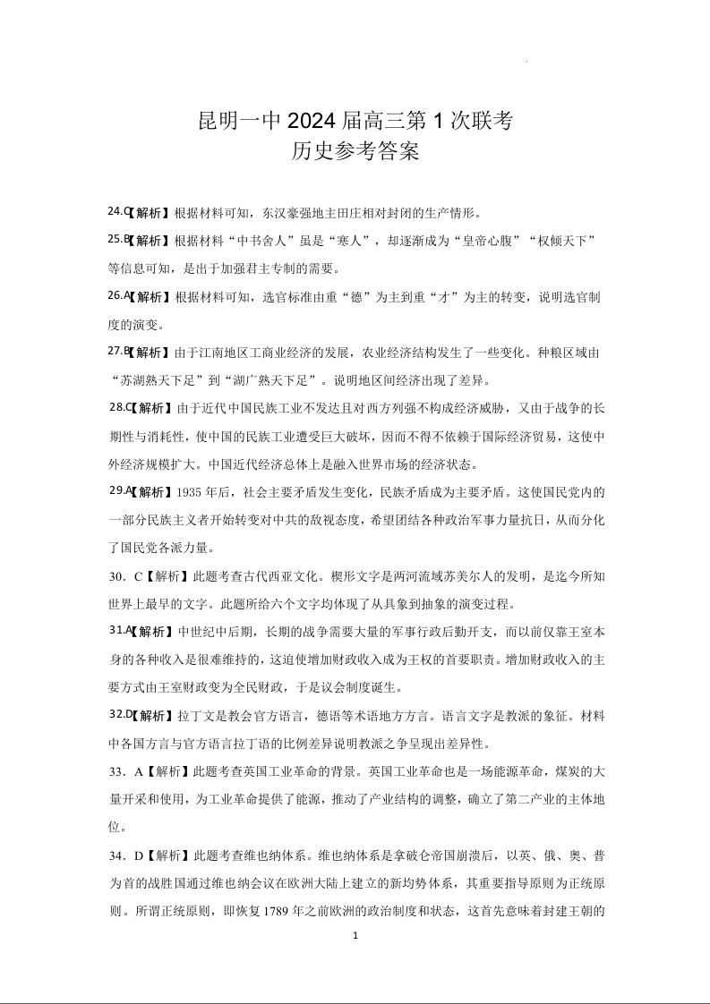 云南省昆明市第一中学2024届高中新课标高三第一次摸底考历史答案