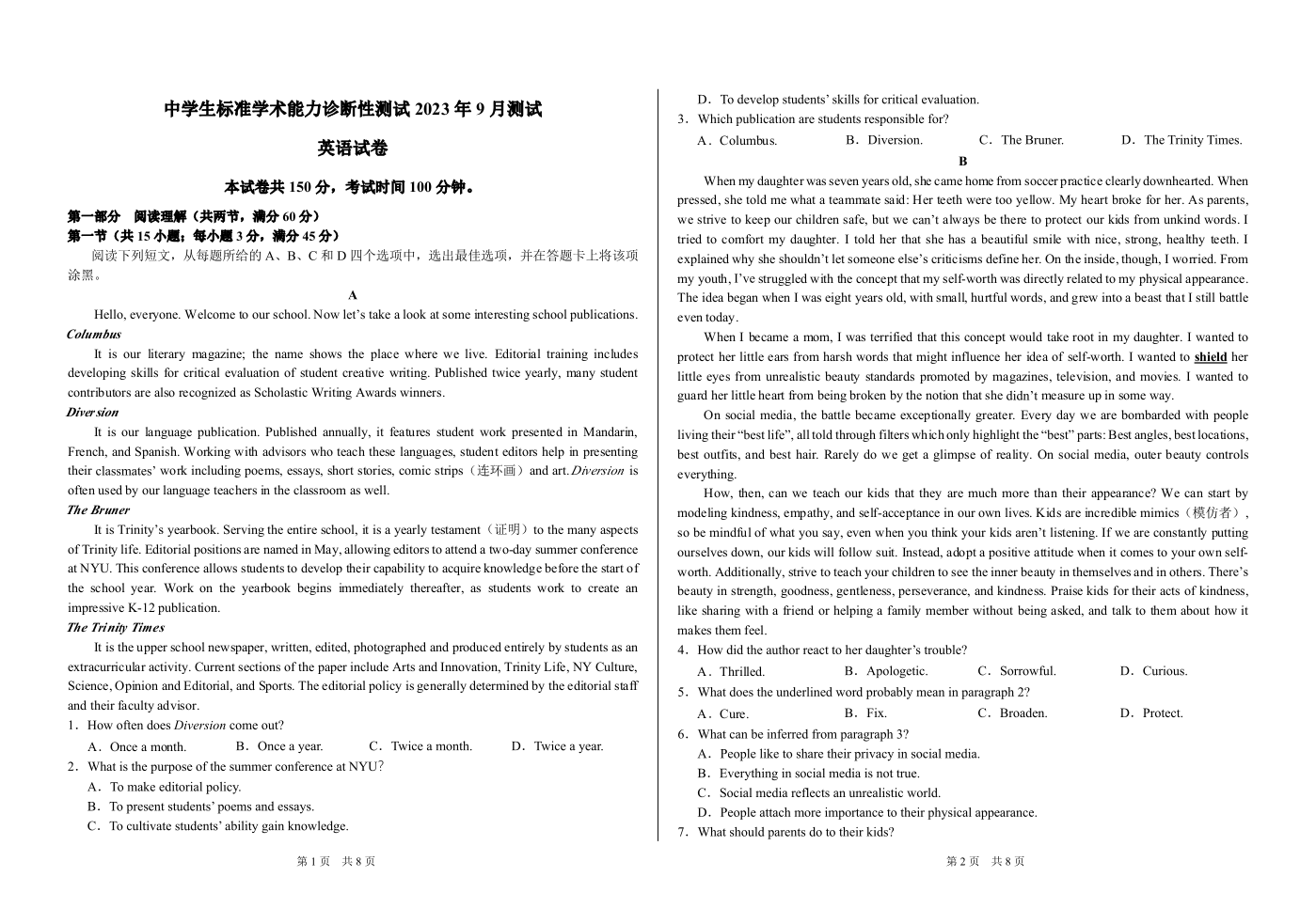 THUSSAT中学生标准学术能力诊断性测试2024届高三上学期9月测试英语