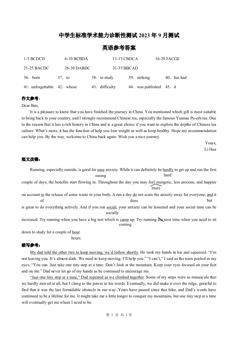 THUSSAT中学生标准学术能力诊断性测试2024届高三上学期9月测试英语答案
