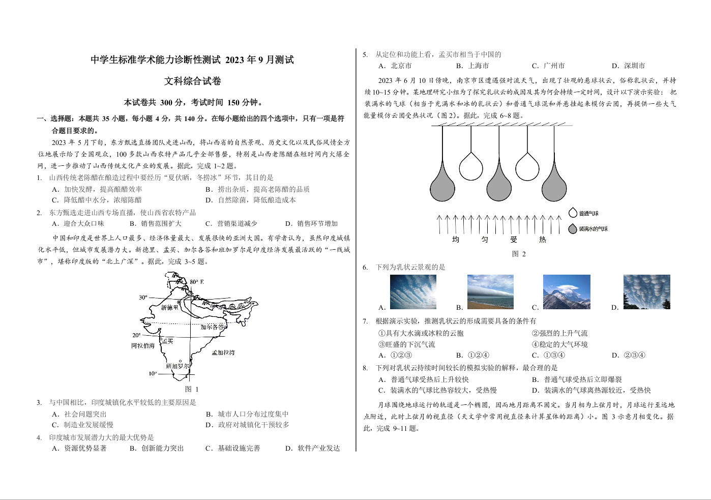 THUSSAT中学生标准学术能力诊断性测试2024届高三上学期9月测试文科综合试卷