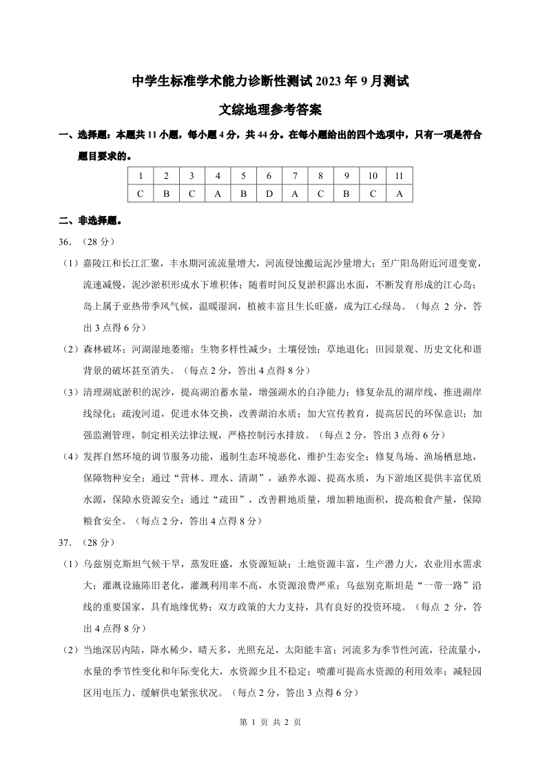 THUSSAT中学生标准学术能力诊断性测试2024届高三上学期9月测试文科综合地理答案