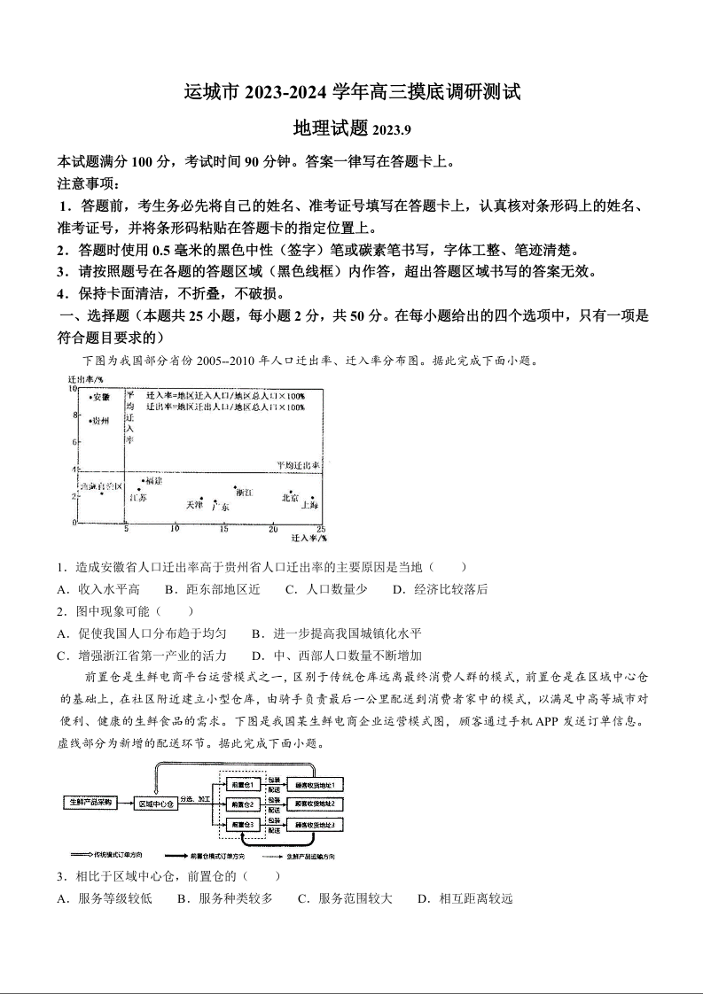 山西省运城市2024届高三上学期摸底考试地理+答案