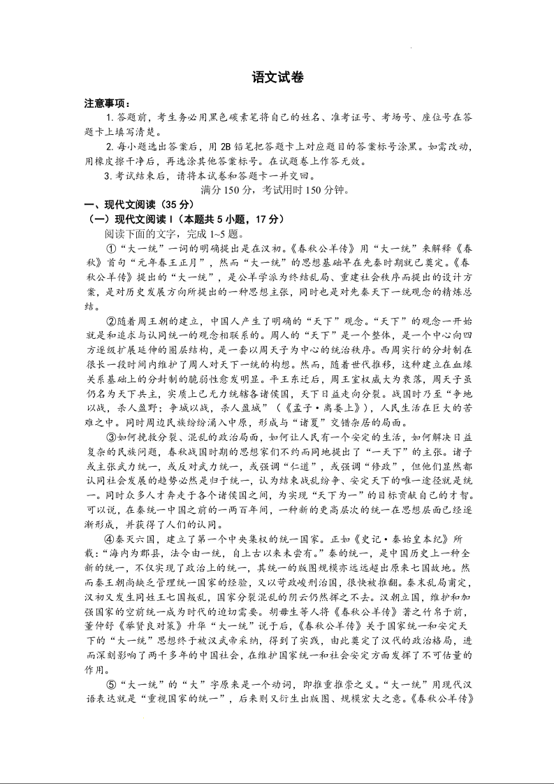 云南师范大学附属中学2024届高考适应性月考卷(三)语文+答案