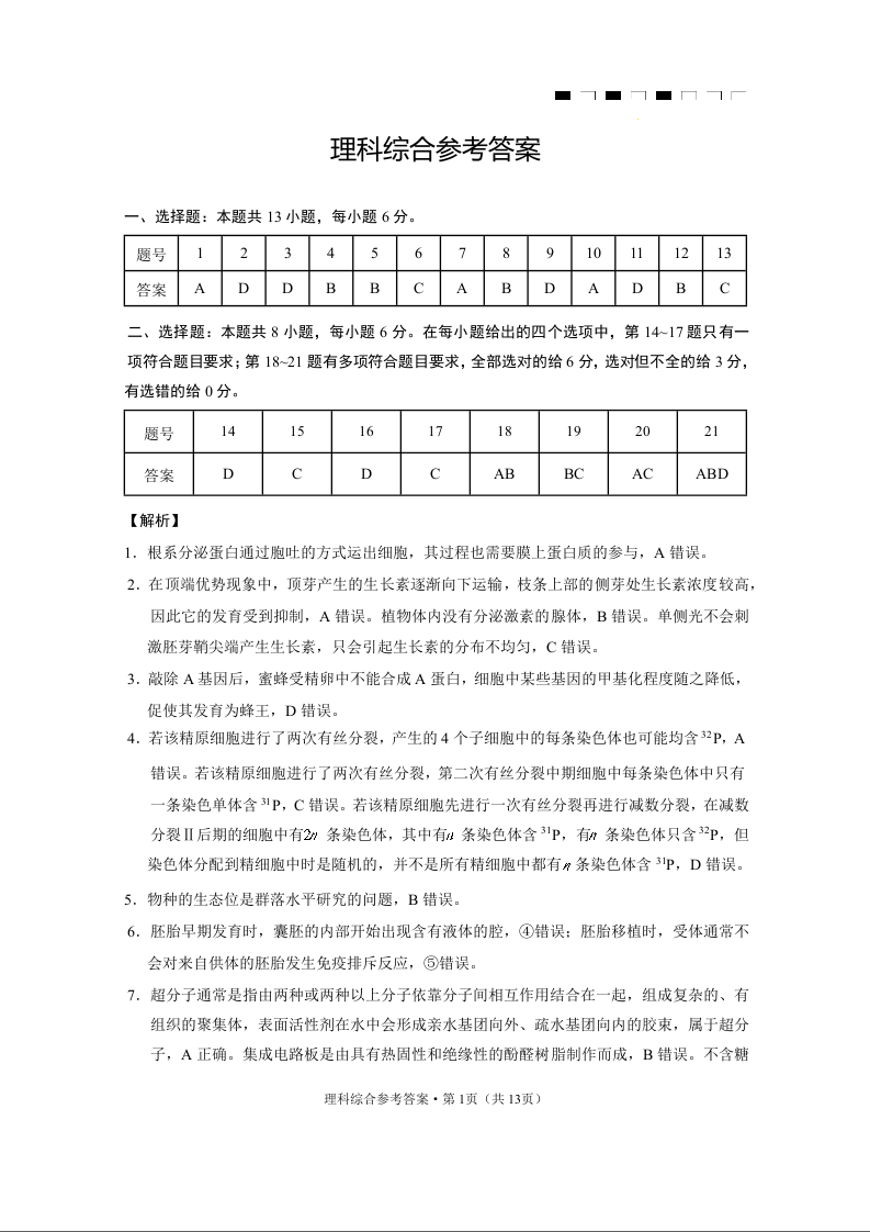 云南师范大学附属中学2024届高考适应性月考卷(三)理综答案
