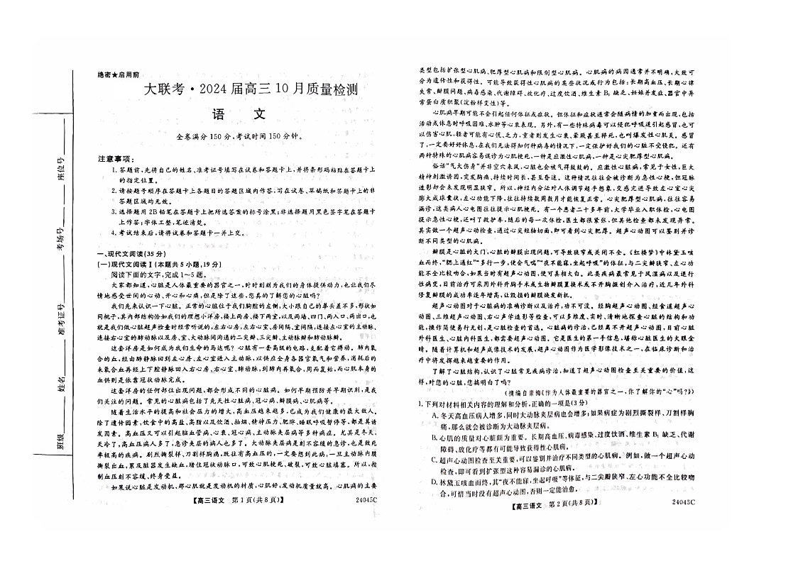 山西省部分学校2024届高三上学期10月联考语文+答案