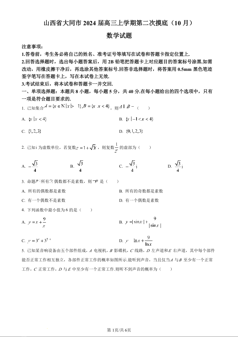 山西省大同市2024届高三上学期10月月考数学(原卷版)