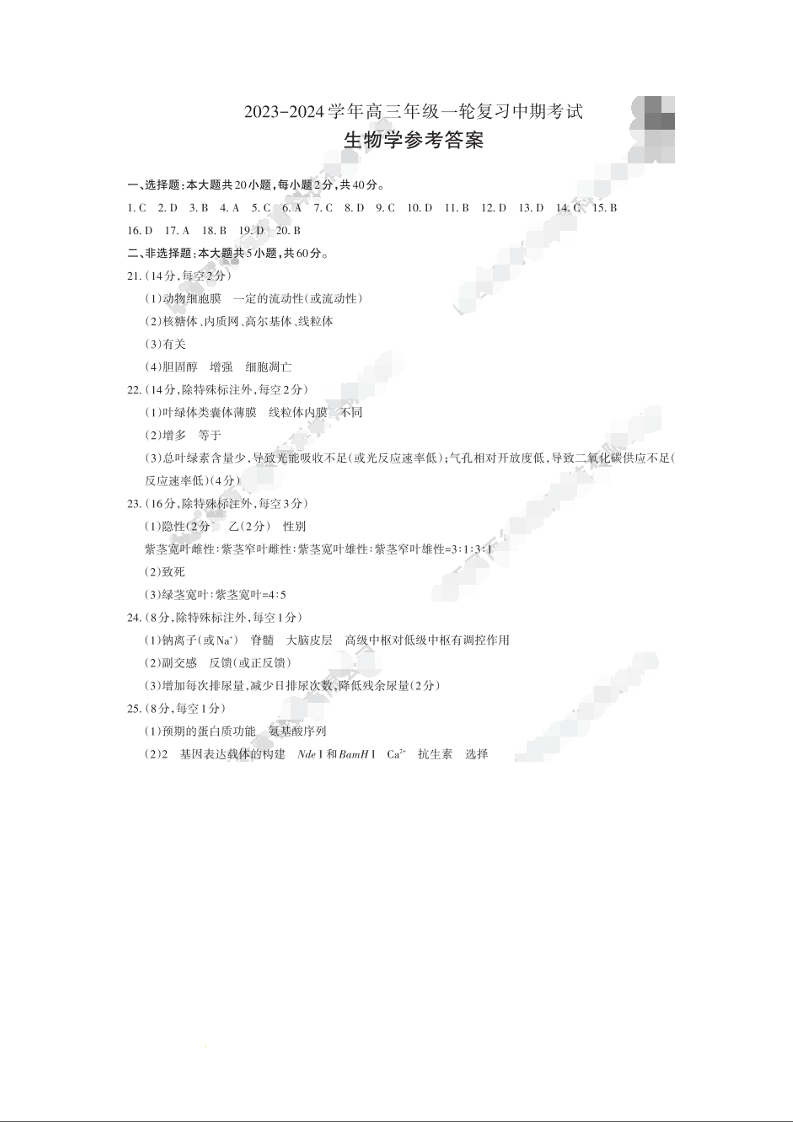 山西省大同市2024届高三上学期10月月考生物答案