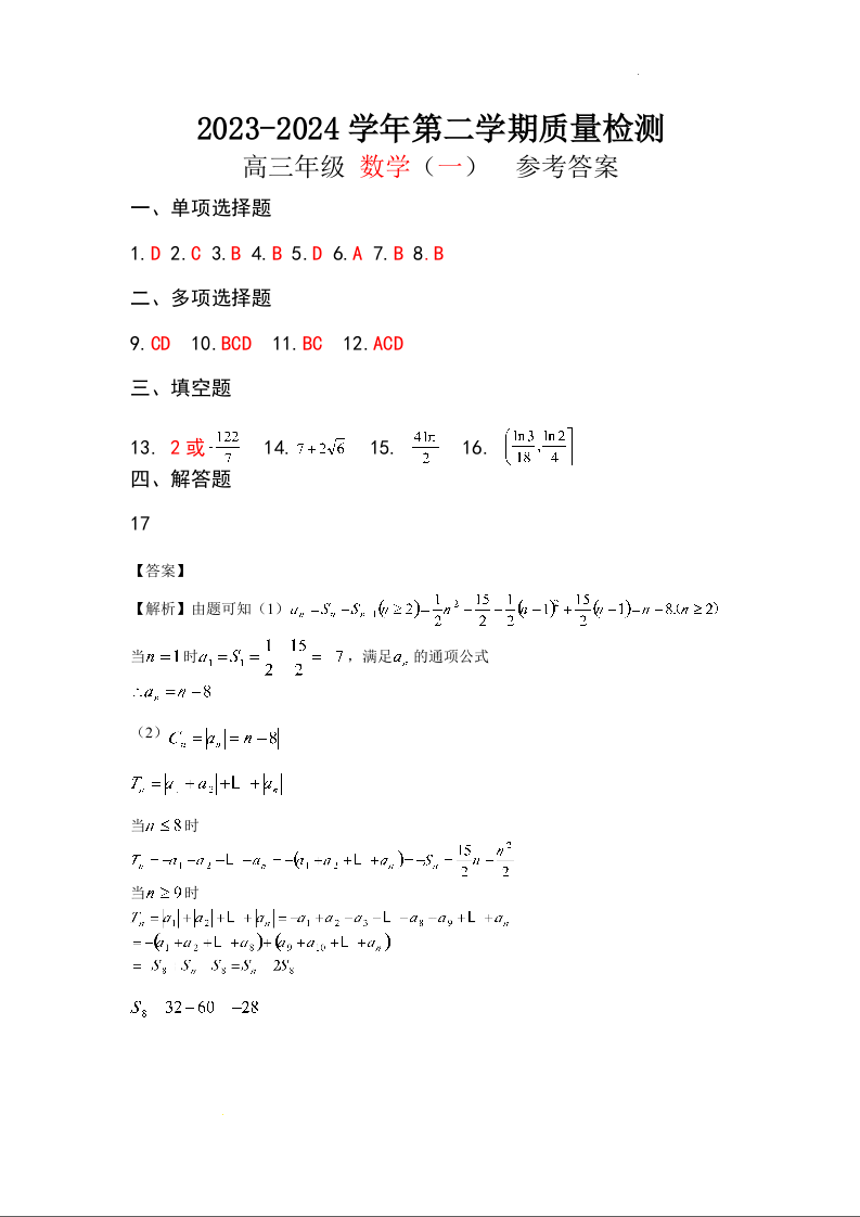 云南省2024届高三上学期10月第一次质量检测数学答案