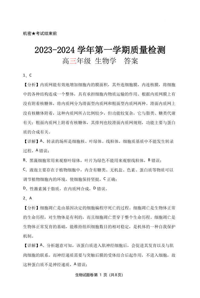 云南省2024届高三上学期10月第一次质量检测生物答案