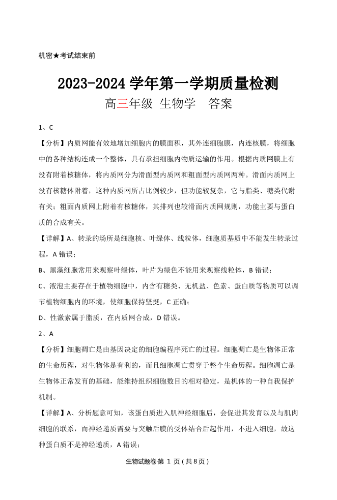 云南省2024届高三上学期质量检测(一)生物答案