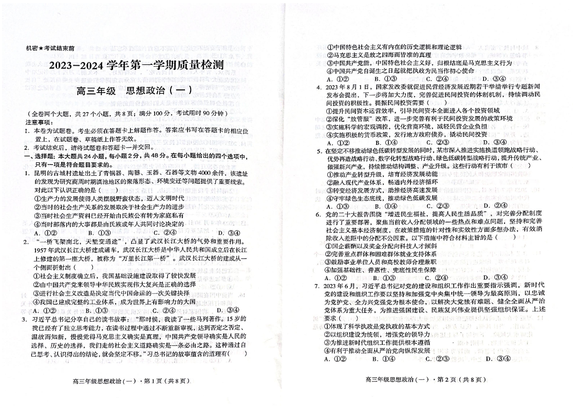 云南省2024届高三上学期质量检测(一)政治
