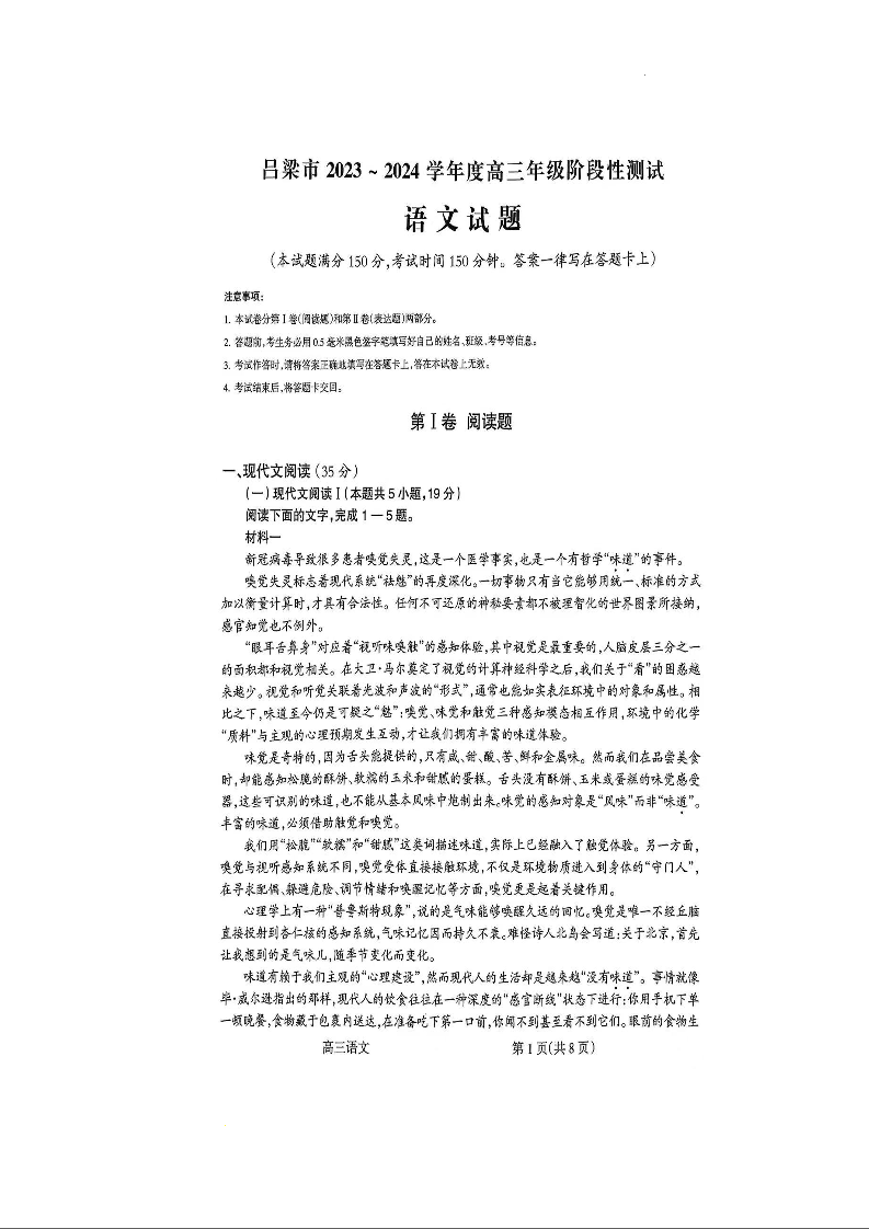 山西省吕梁市 2024届高三上学期阶段性测试(一模)语文