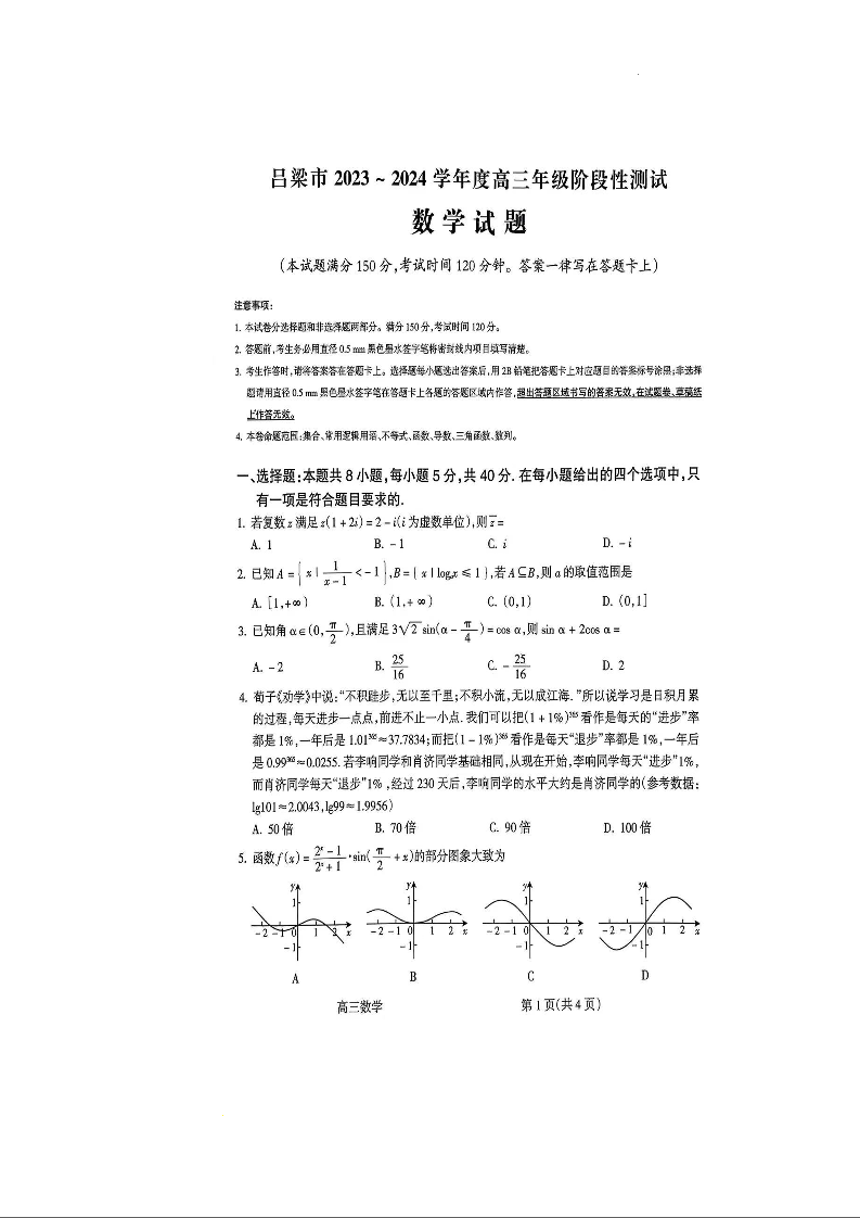 山西省吕梁市 2024届高三上学期阶段性测试(一模)数学
