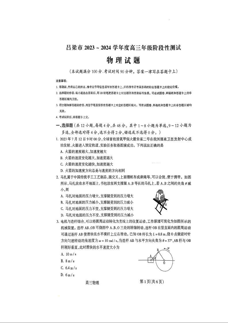 山西省吕梁市 2024届高三上学期阶段性测试(一模)物理