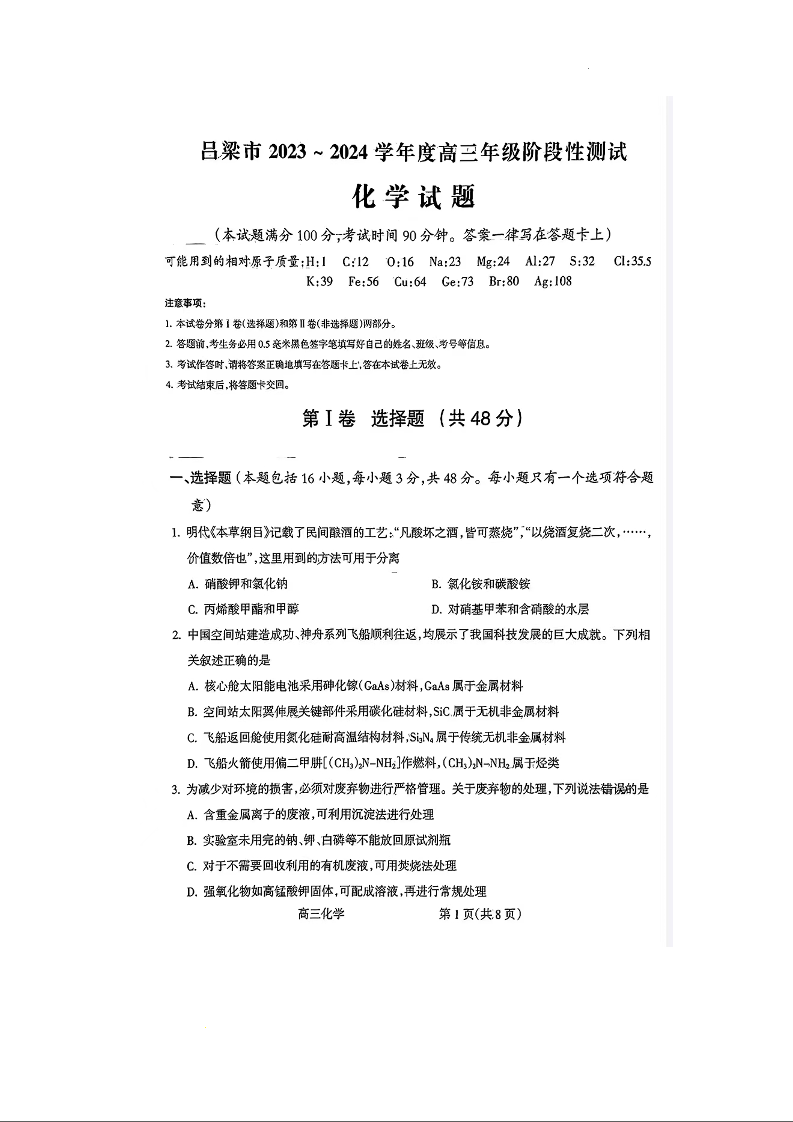 山西省吕梁市 2024届高三上学期阶段性测试(一模)化学