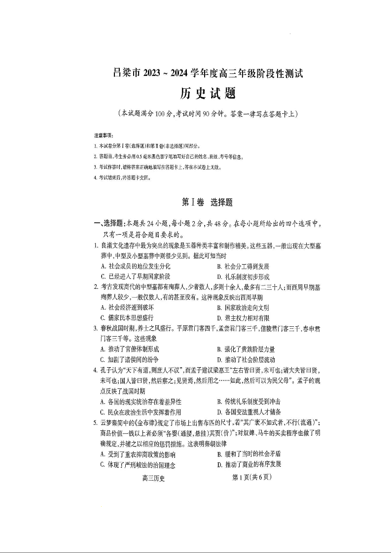 山西省吕梁市 2024届高三上学期阶段性测试(一模)历史