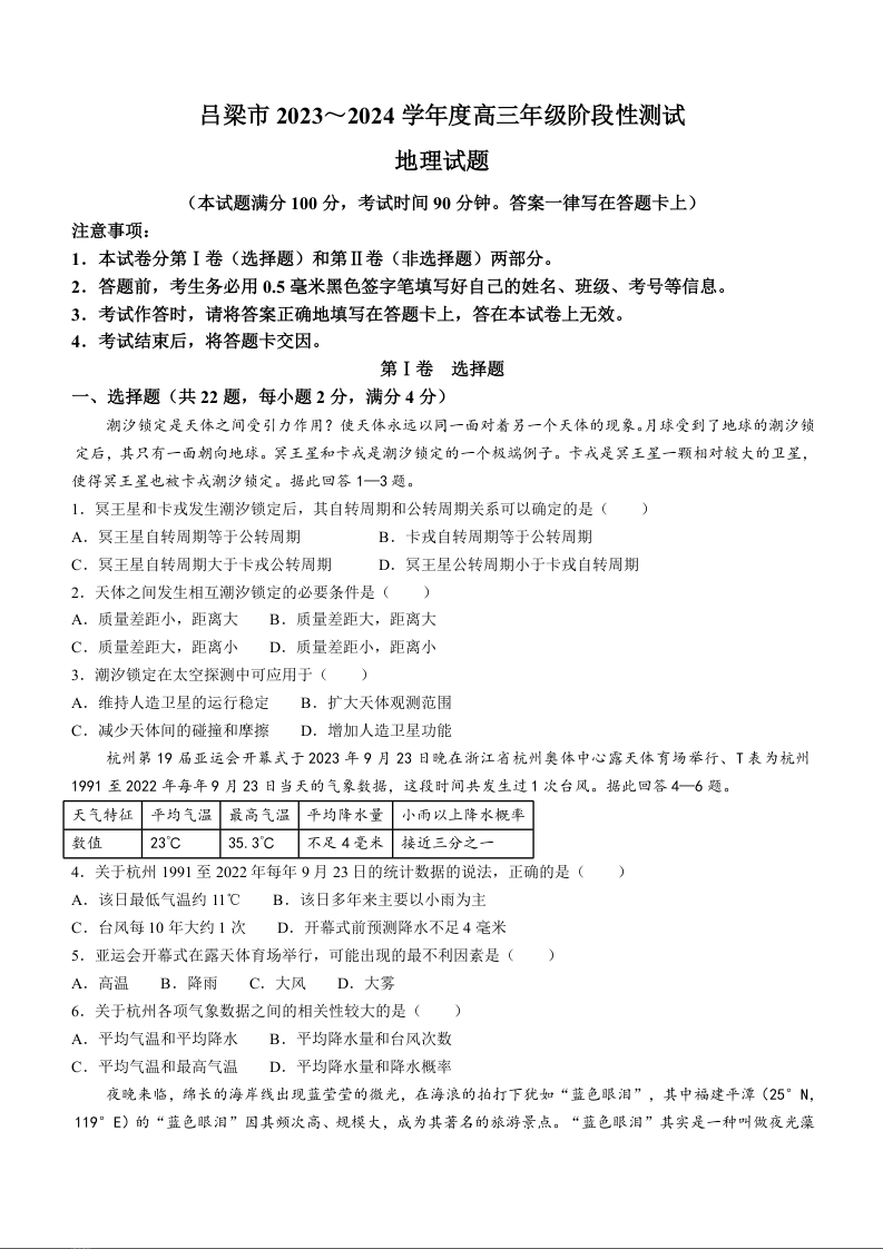 山西省吕梁市 2024届高三上学期阶段性测试(一模)地理