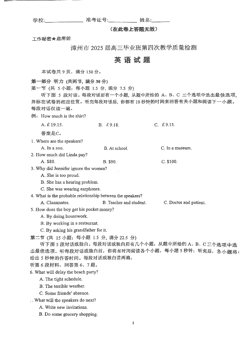 福建省漳州市2025届高三毕业班第四次教学质量检测英语