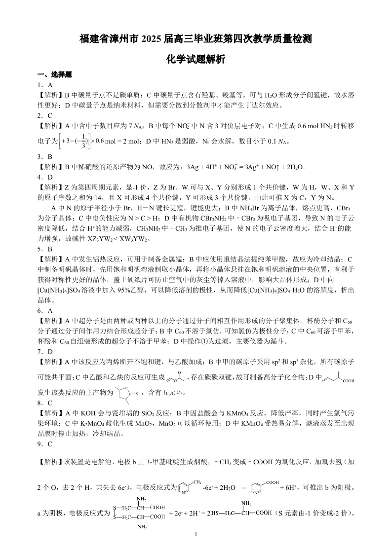 福建省漳州市2025届高三毕业班第四次教学质量检测化学答案