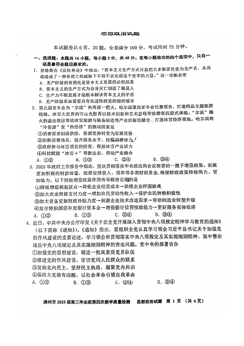 福建省漳州市2025届高三毕业班第四次教学质量检测政治