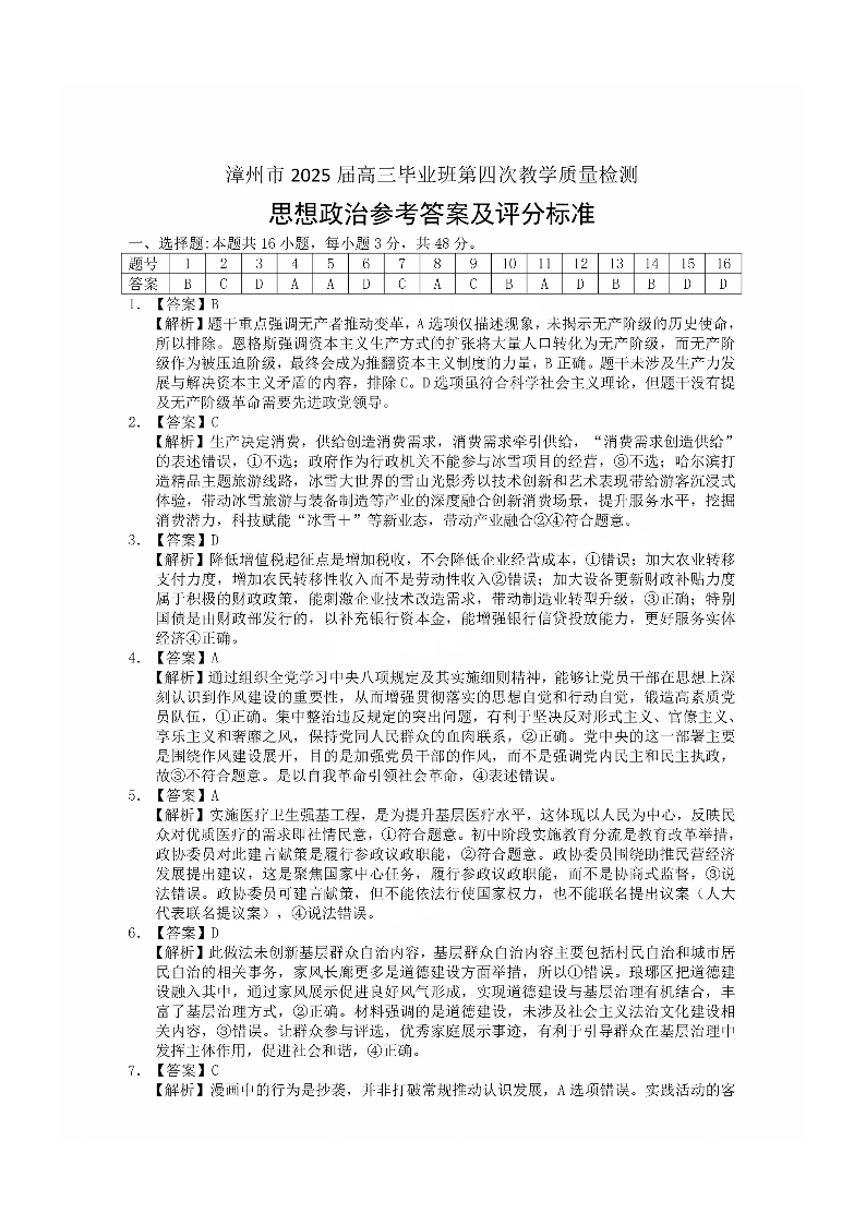 福建省漳州市2025届高三毕业班第四次教学质量检测政治答案