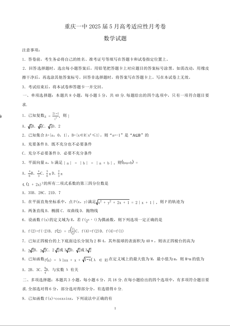 重庆市第一中学校2025届高三下学期5月适应性月考(七)数学