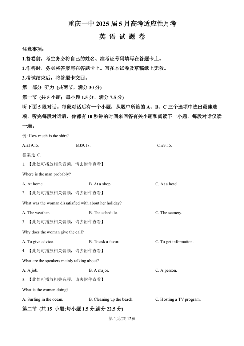重庆市第一中学校2025届高三下学期5月适应性月考(七)英语(原卷版)