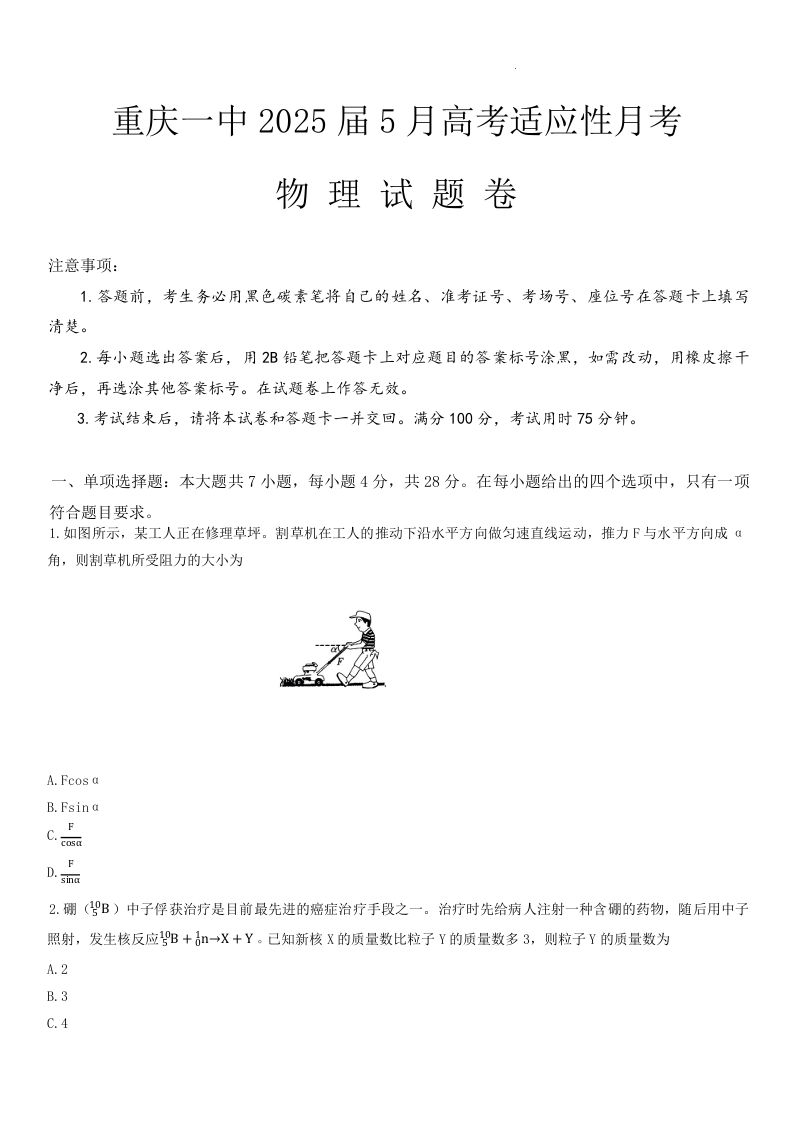 重庆市第一中学校2025届高三下学期5月适应性月考(七)物理+答案