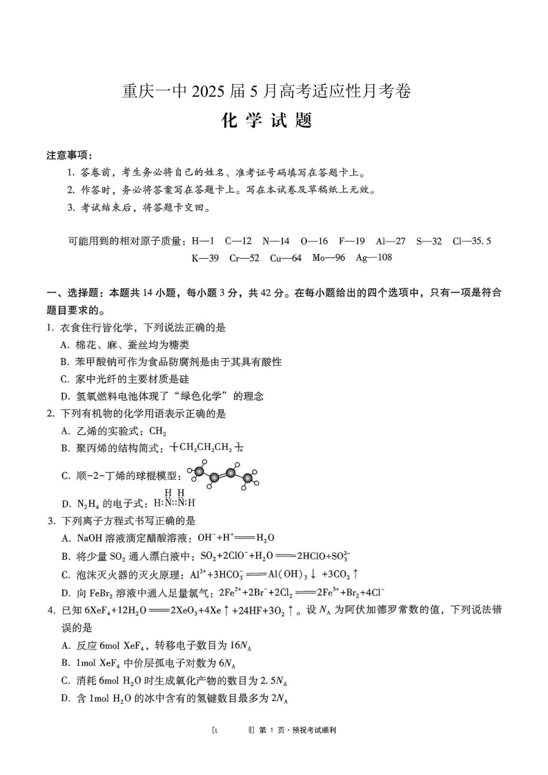 重庆市第一中学校2025届高三下学期5月适应性月考(七)化学