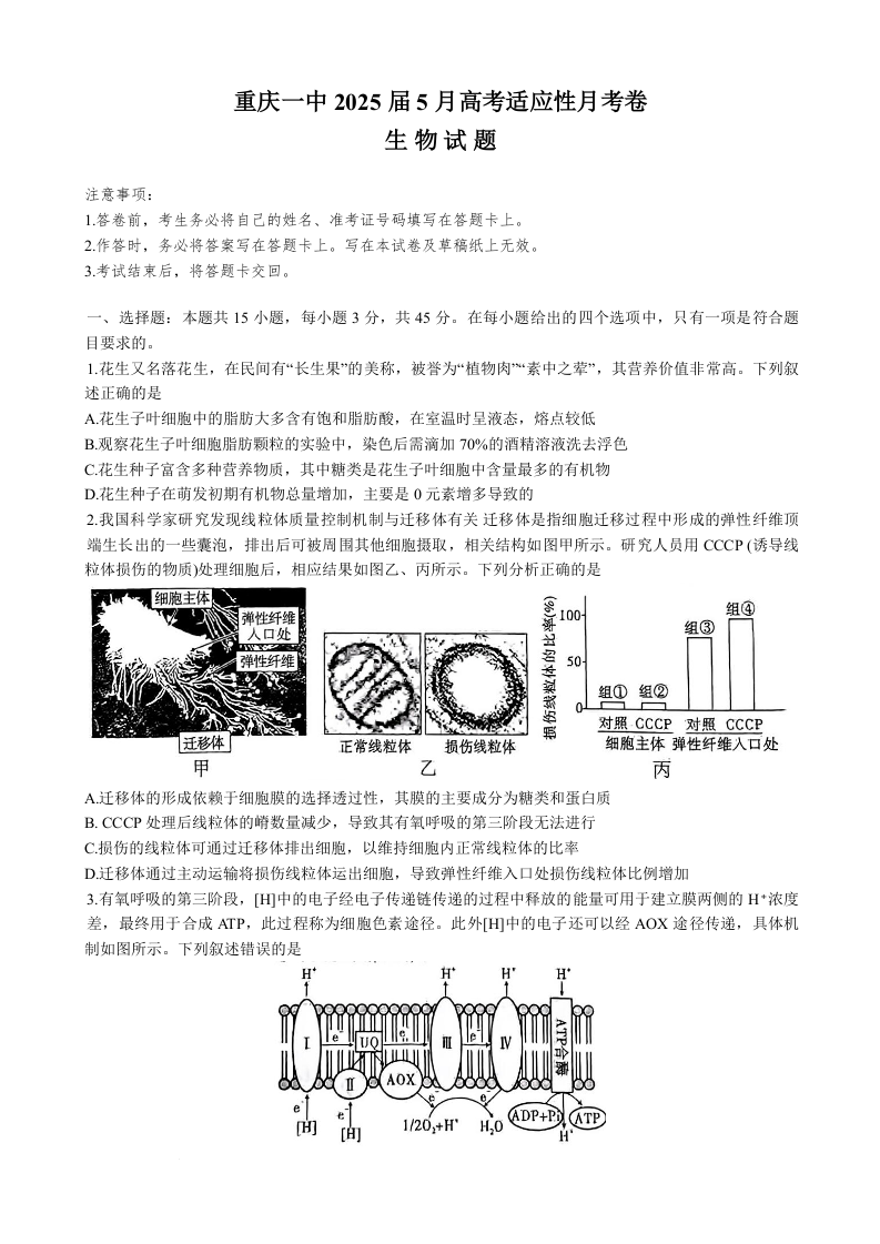 重庆市第一中学校2025届高三下学期5月适应性月考(七)生物+答案