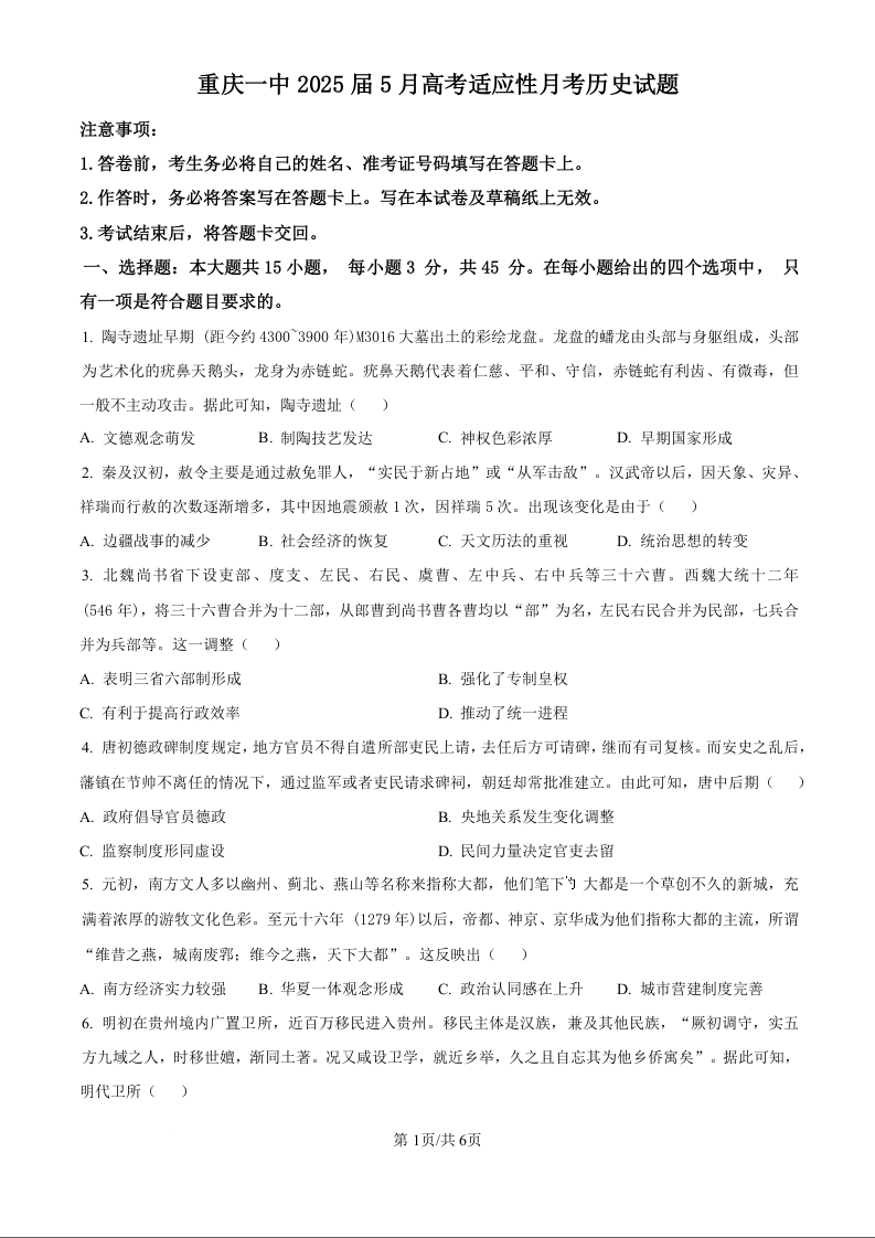 重庆市第一中学校2025届高三下学期5月适应性月考(七)历史(原卷版)