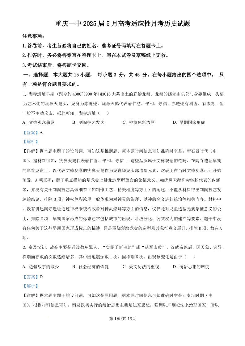 重庆市第一中学校2025届高三下学期5月适应性月考(七)历史(精品解析版)